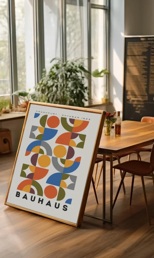 Diseño elegante y geométrico, este póster refleja la esencia del movimiento Bauhaus. Inspirado en la simplicidad y funcionalidad, combina líneas nítidas, formas vibrantes y una paleta moderna. Ideal para quienes aprecian la unión de arte y diseño, añade un toque vanguardista y atemporal a cualquier espacio.